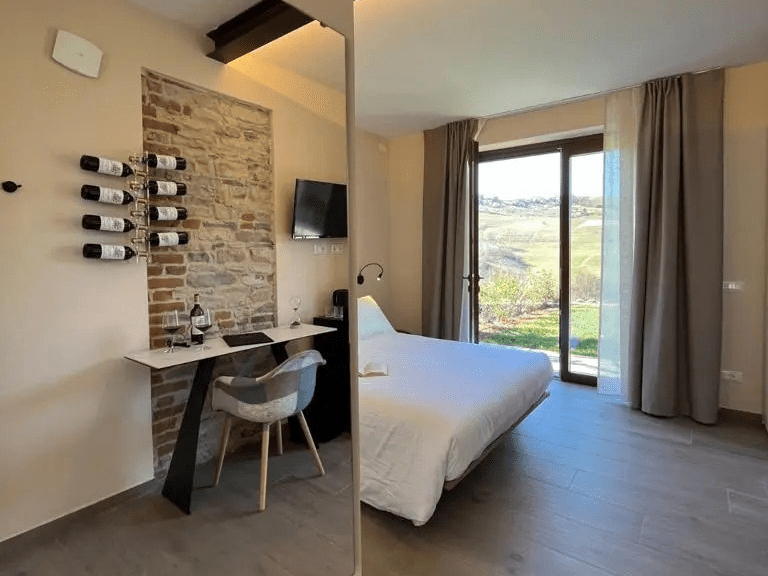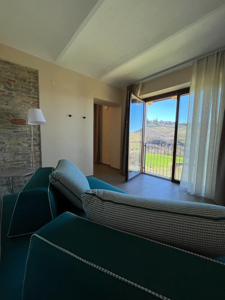 Panorama is our first floor 50 m2 suite with a large bedroom with a panoramic view on the Langhe hills and a small private balcony.
